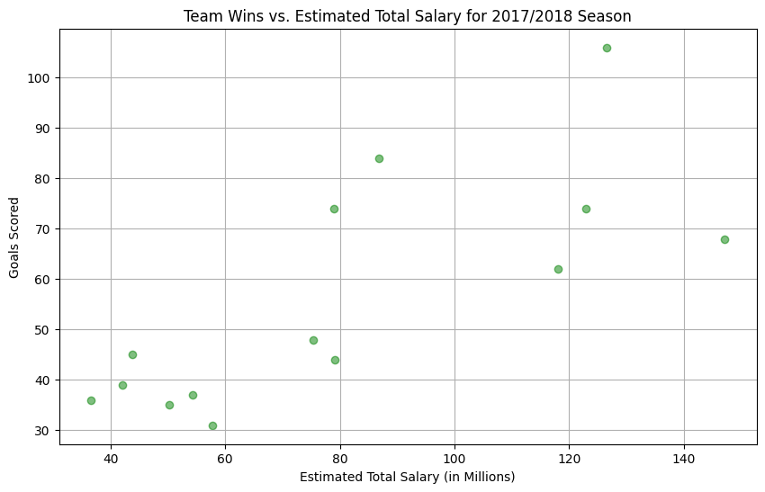 Why do some teams succeed while others consistently sit at the bottom of the Premier League? The relationship between financial investment in player salaries and team performance has been the subject of extensive research. This article employs regression analysis to investigate how estimated total salary impacts a team’s wins and goals scored. While the findings suggest a positive correlation between salary and performance, several considerations warrant a careful interpretation of the results.