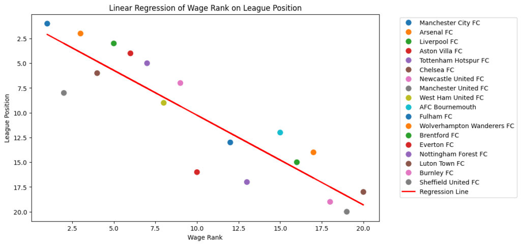 Additionally, we performed a linear regression analysis to predict league positions based on wage rank. The regression line (shown in red on the scatter plot below) further confirms that higher spending on wages is associated with better league performance.