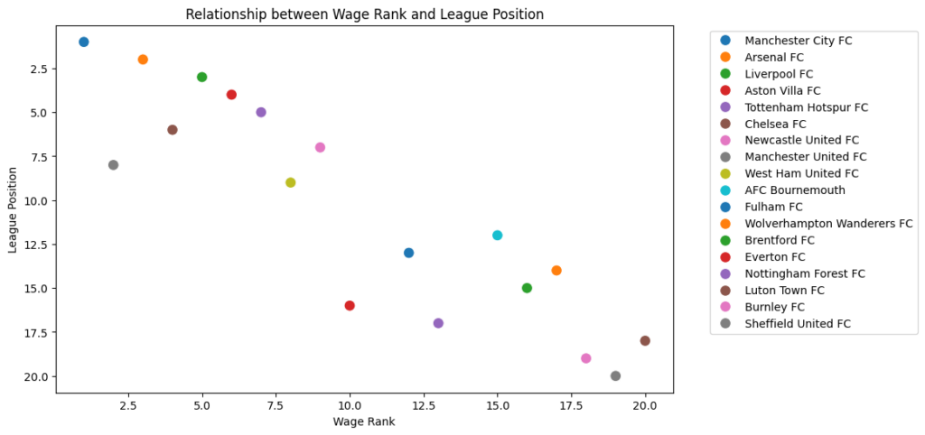 To understand this relationship, we analyzed data from the 2023-2024 season, which included the league positions and wage ranks of various teams. The wage rank indicates how much teams spend on player wages compared to others, with a lower rank meaning higher spending.