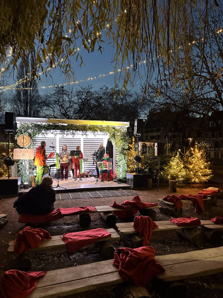But the moment that made Strasbourg our favorite part of the entire trip? One eening walking past the Petite France area along the canals and stumbling into a smaller Christmas village set up behind the main Petite France district. There was caroling, small market stalls, and decorations on the buildings that felt like they’d been there for centuries. No crowds. No rush. Just the canal, the lights, and the sound of Christmas music echoing off the water.